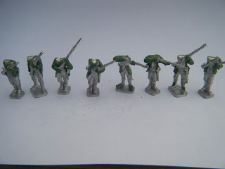 While I wait for the Revolutionary Armies Vendee range to release I dived into my figure stash and pulled some Perry AWI skirmishing southern militia figures, sculpted feathers and cockades and the odd Vendee heart badge. Then painted them in two batchs, and based them. I have completed the first 12 with a further 12 on the table at the moment. These will act as a stand alone skirmish line  for British Grenadier rules until I complete mine.